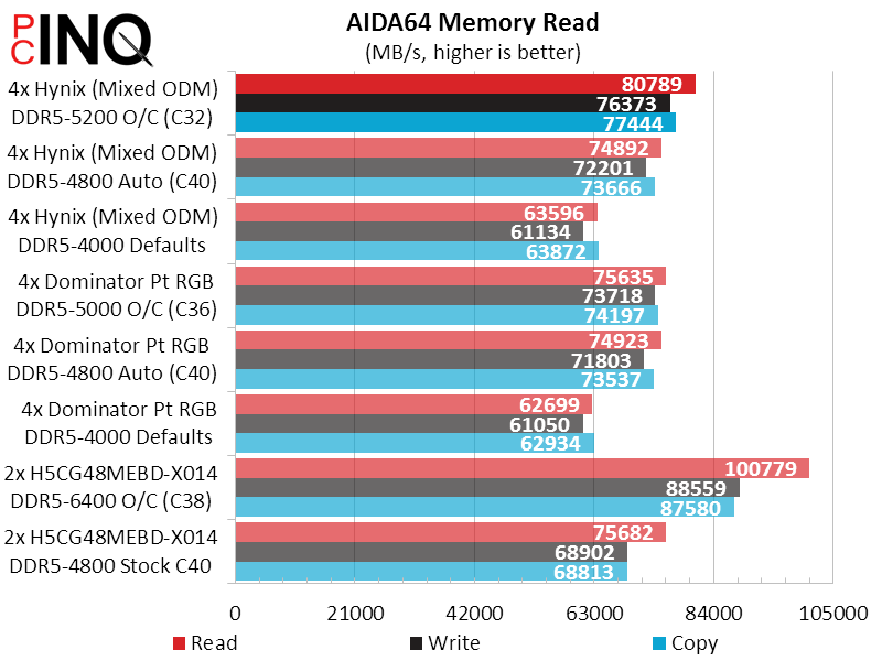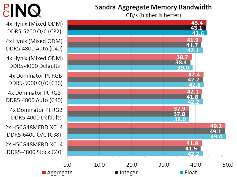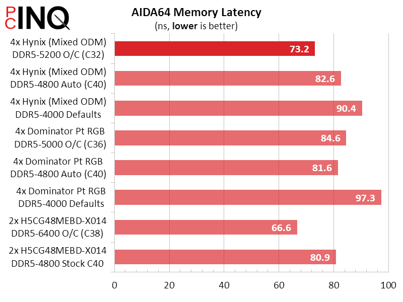 SiSoftware Sandra shows miniscule bandwidth gains for the presence of four DIMMs at the same DDR5-4800 setting, but the latency didn’t get worse either. AIDA64 shows an increase in write bandwidth.