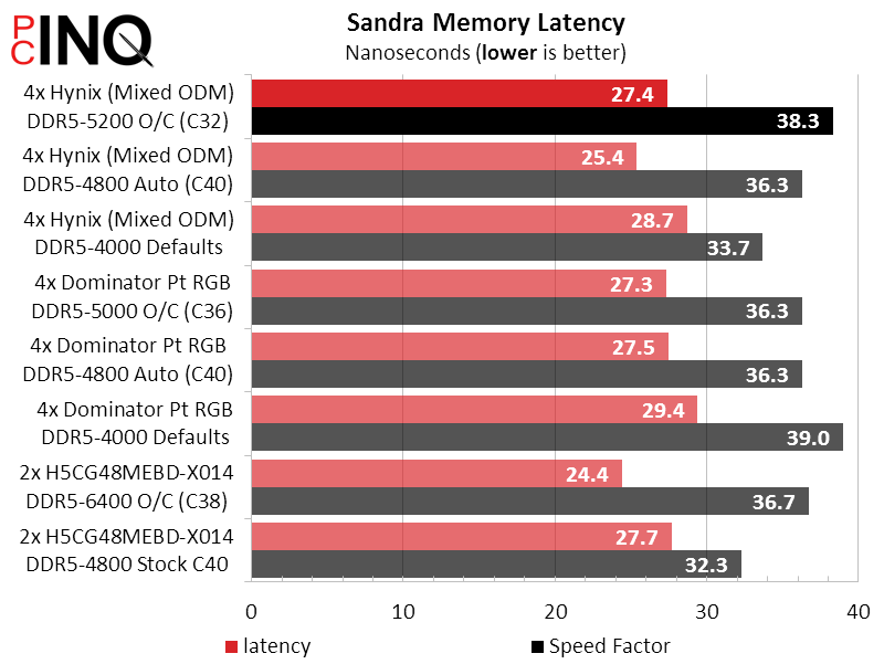 We should probably let everyone know that we limited our overclocking attempts to 1.35V VDD and VDDQ and did try various “in between” voltage levels, so there’s plenty of room for advanced overclockers to try something else. Having said that, the best we’ve seen so far of an XMP-rated quad-DIMM kit is DDR5-5200, so we’re fair comfortable with the results we achieved in our Patriot/Sabrent mix of Hynix H5CG48MEBD-X014 ICs.