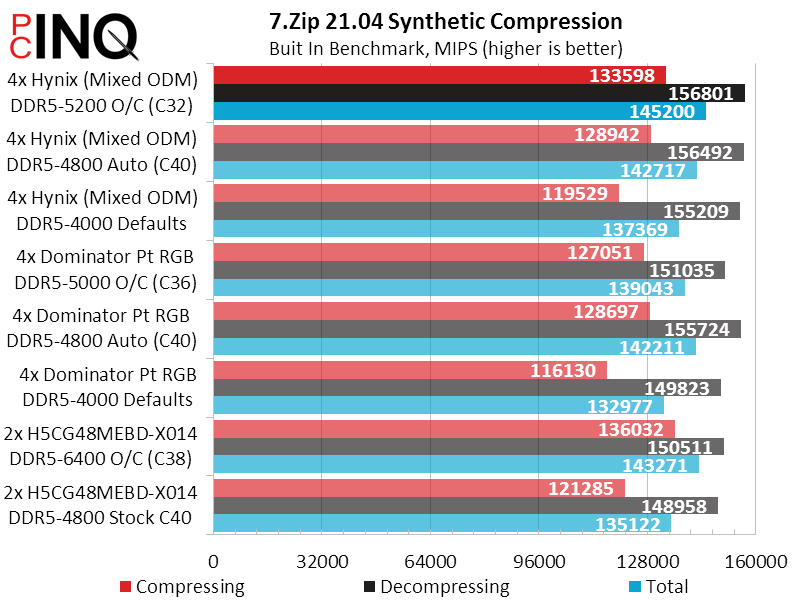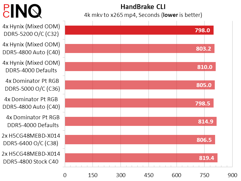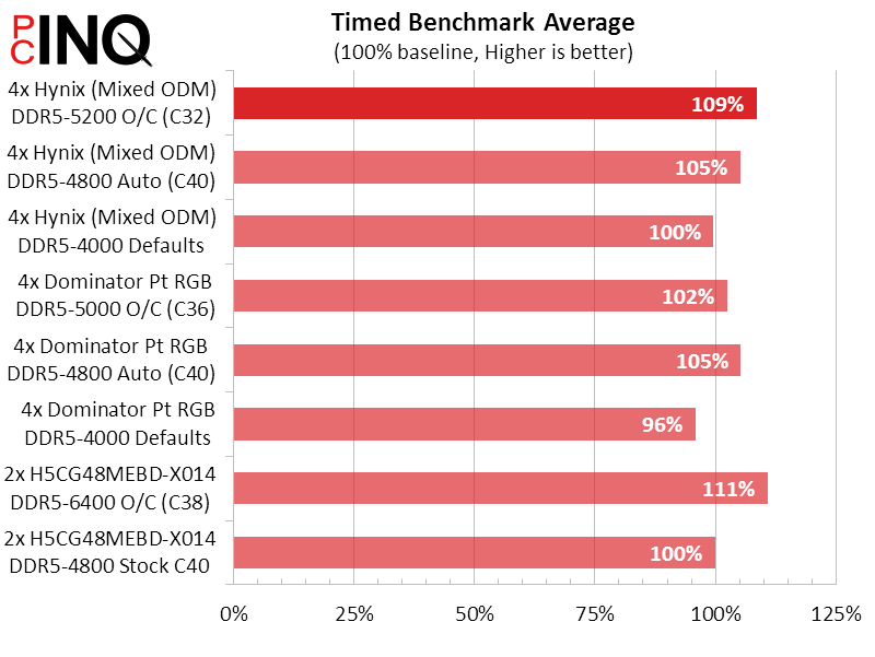 The basics in our timed benchmark average are seen at DDR5-4800 C40, where four DIMMs are 5% faster than two. Overclocking gets us even farther.