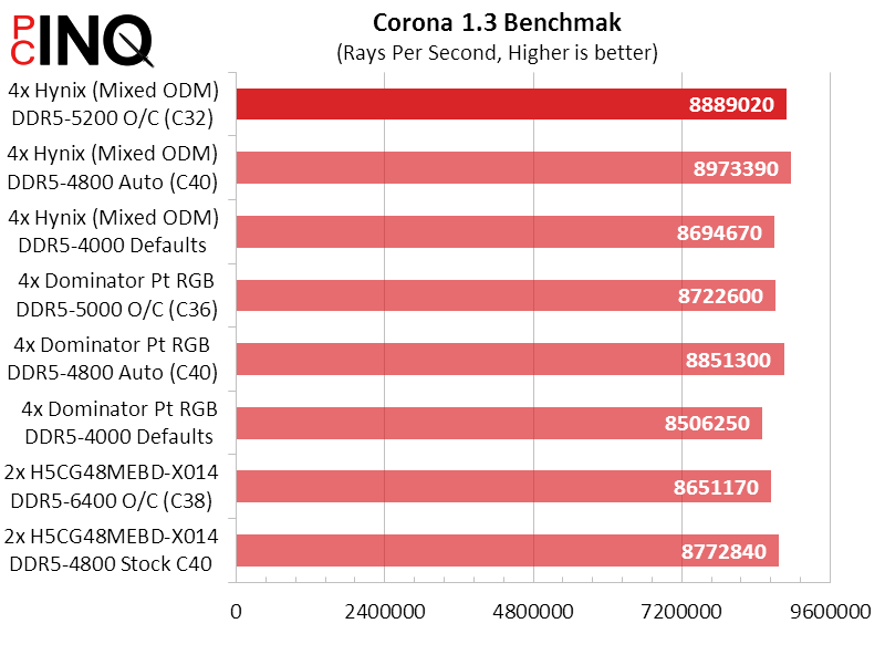 7-Zip shows the benefits of four ranks of memory in its file decompression test. Handbrake also finishes its encode a bit more quickly with four DIMMs, and Corona Benchmark even produces a few more rays per second.
