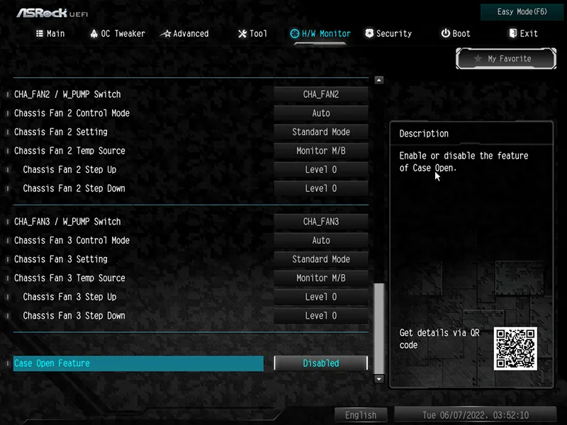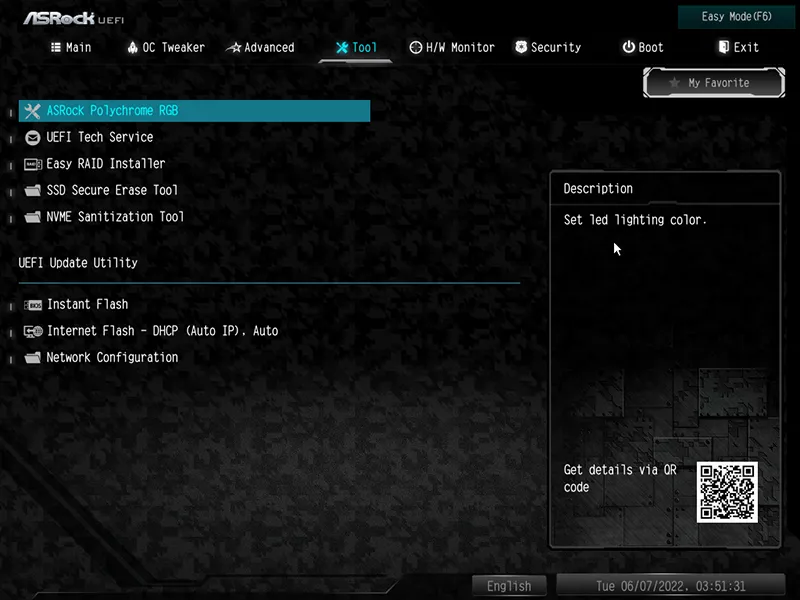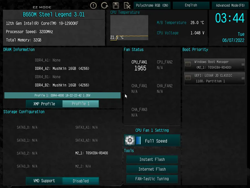 B660M Steel Legend firmware defaults to an “Easy Mode” GUI, where users can enable their memory’s XMP modes and set boot order and/or fan profile. A button at the top switches the light strip on the back of the motherboard on and off, while additional buttons on the bottom enable firmware flash mode, firmware downloading mode (via Ethernet), and a fan tuning graph.