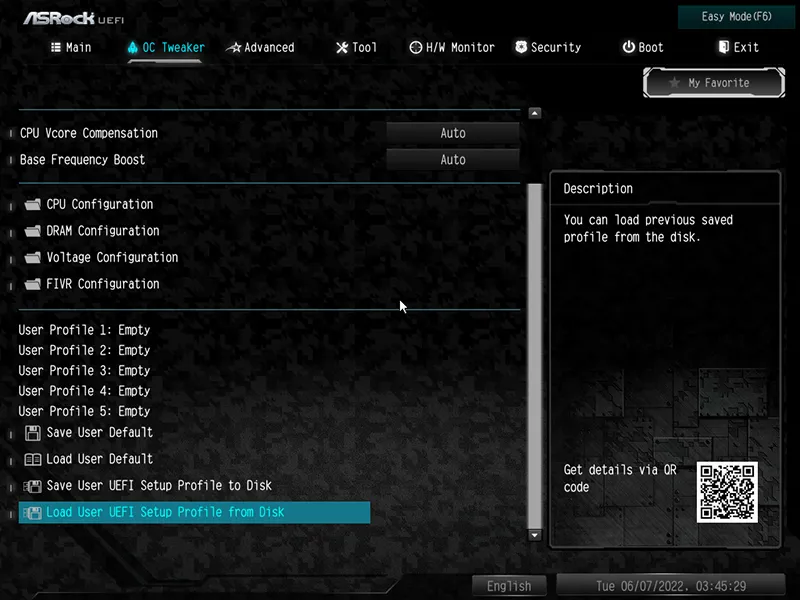 Pressing the ‘F6’ function key of a connected keyboard brings up the firmware’s advanced GUI, where the OC Tweaker menu still provides a bunch of voltage and clock control settings that we’d normally associate with overclocking…but with CPU core multipliers limited to default ratios. Users are still welcomed to save their custom settings as user profiles and import/export those using a thumb drive, and that might be useful for the one component that’s still overwhelmingly tunable via the motherboard: DRAM.