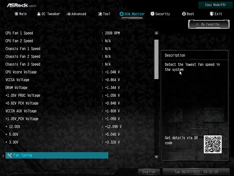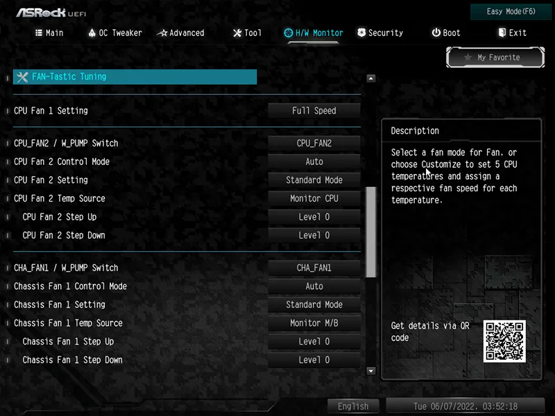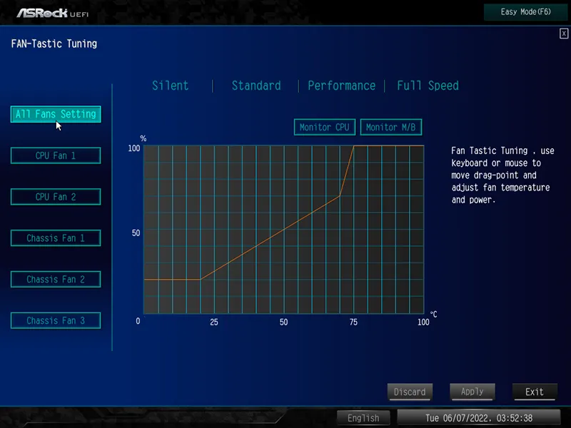 The Hardware Monitor menu is primarily used for fan configuration, and includes a link to the same “Fan Tuning” graphical settings that can also be brought up through Easy mode.