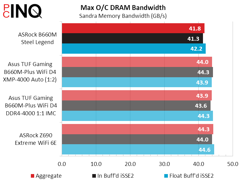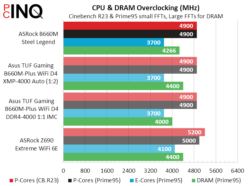 Remembering that the Core i9-12900KF’s default behavior is to drop its boost frequency to 4.9GHz when all cores are loaded, the first thing we see is that the B series motherboards go no higher under these loads. Both ASRock boards drop the CPU’s memory controller to Intel’s Gear 2 mode when exceeding DDR4-4000, and the B660M-Plus WiFi D4 uses Gear 2 to support DDR4-4000 by default. Only when forced to run in Gear 1 mode did the TUF Gaming board give up on overclocking our memory, and that’s probably because our CPU’s memory controller isn’t stable at frequencies significantly beyond 2000 MHz. To the point: Both comparison boards overclocked our DDR4-4000 kit to DDR4-4400, but the B660M Steel Legend reached only DDR4-4266.