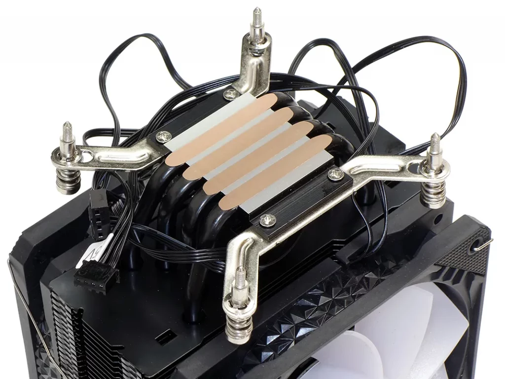 Mounting brackets attach to the top of the base plate’s side tabs, and are secured from underneath with a pair of screws on each side. Also seen here are the four-pin PWM (power) and addressable LED headers: These are hard wired to both fans without removable splitters, so that the fans are permanently “paired”.