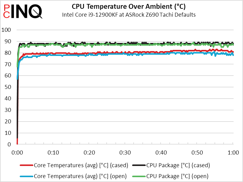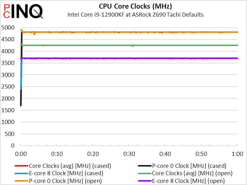 We first tested the cooler with our motherboard mounted normally inside our case and our case fans at max RPM and, after noticing the high temperatures, retested the “platform” outside the case. Even though our case fans added airflow, the Eleos 12 Duo RBW maintained a slightly cooler temperature when tested in the open air. While we’re not exactly happy with the temperatures, they’re only 10° warmer than that of our enormous custom liquid cooling configuration. Our frequency chart will be the final determining factor regarding whether this cooler “skates by” in this highest-load scenario.