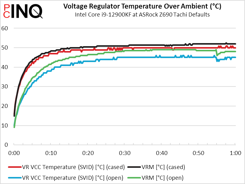 Intel’s CPUs are capable of dropping the voltage slightly and checking for stability before being forced to throttle down, and that appears to happen here as our CPU Core VIDs hold steady at ~1.28V, where it fluctuated between ~1.26 and ~1.30V under liquid cooling. Given that our frequency was “nailed down”, it still passed.